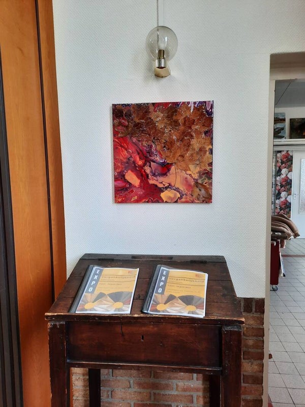 50 x 50 cm acrylic pouring op canvas met epoxy afwerking. In de epoxy zijn natuurlijke bladeren gebruikt. Het schilderij heeft een 3D effect.