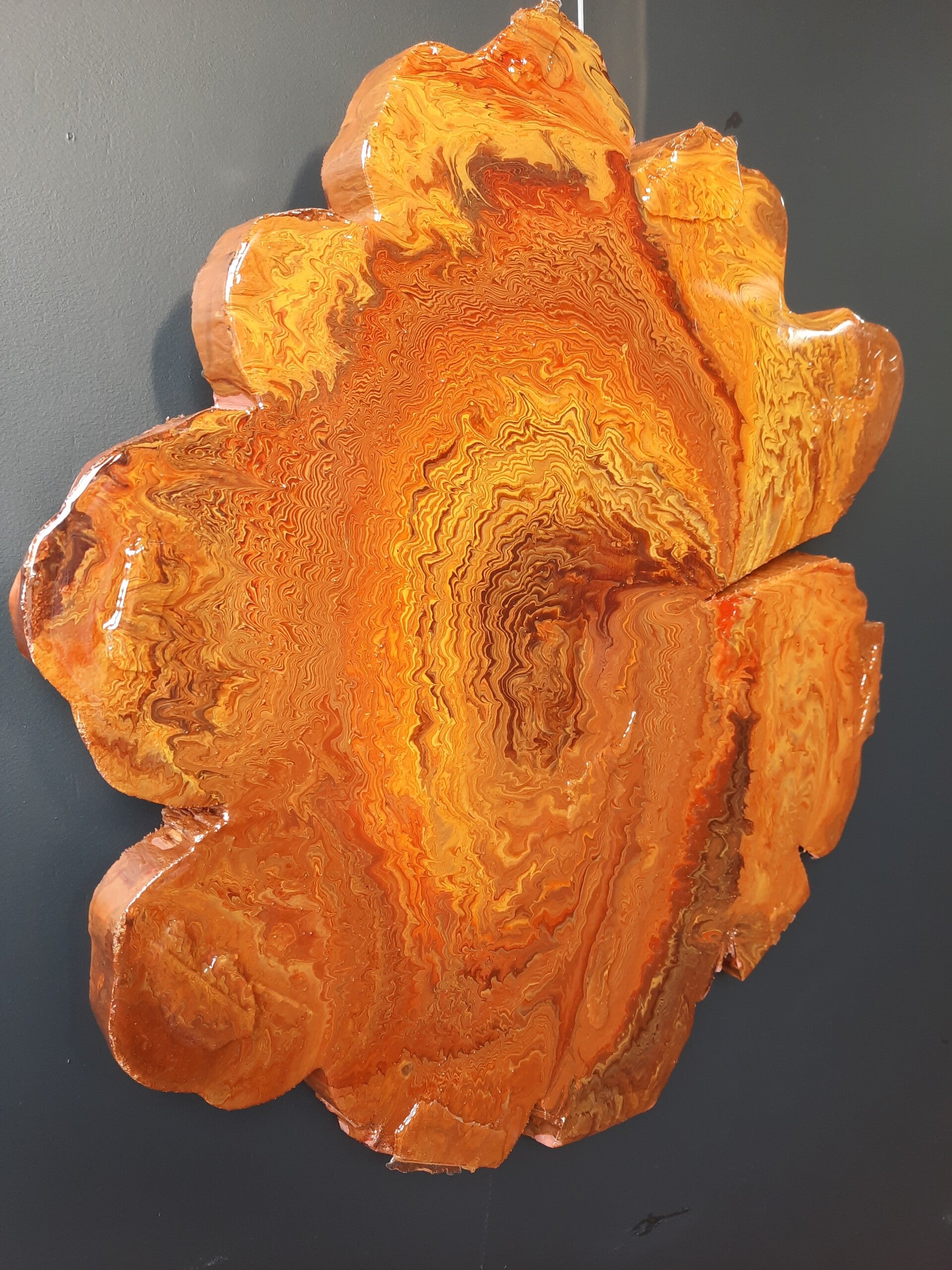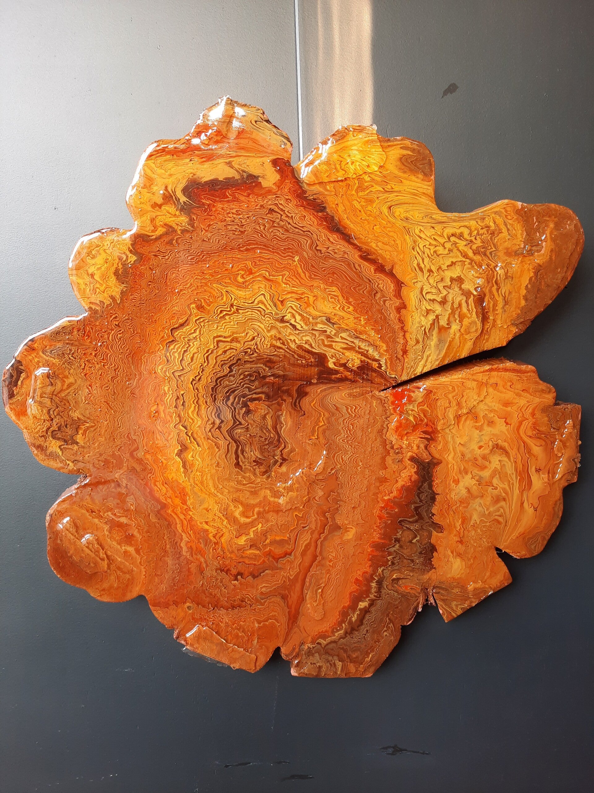 Acryl gieten op een boomstamschijf. De jaarringen met de acrylgiet techniek weergegeven. Door de epoxy afwerking is het smeltende ijs een 3d effect.