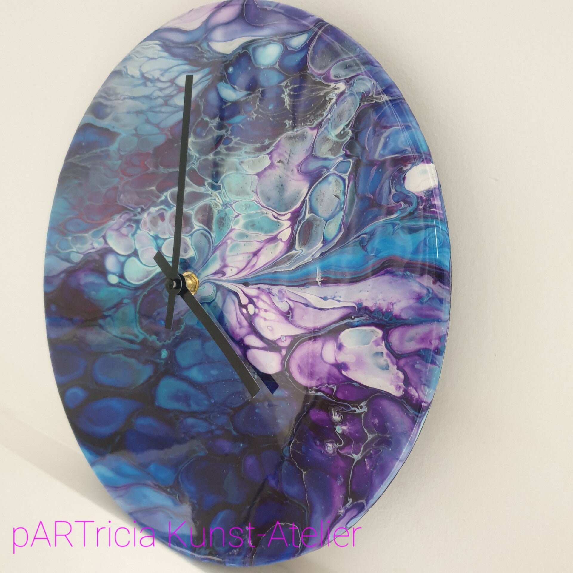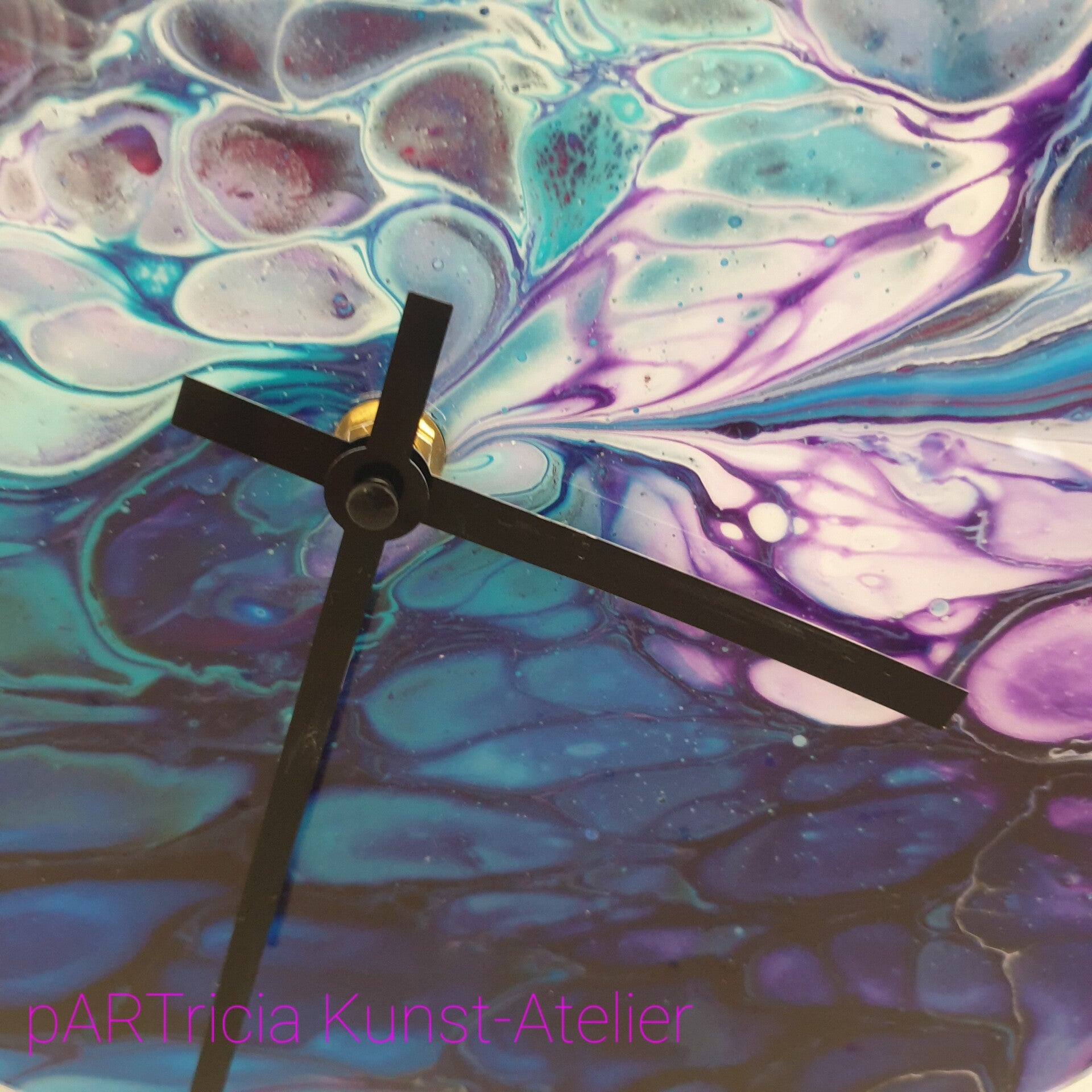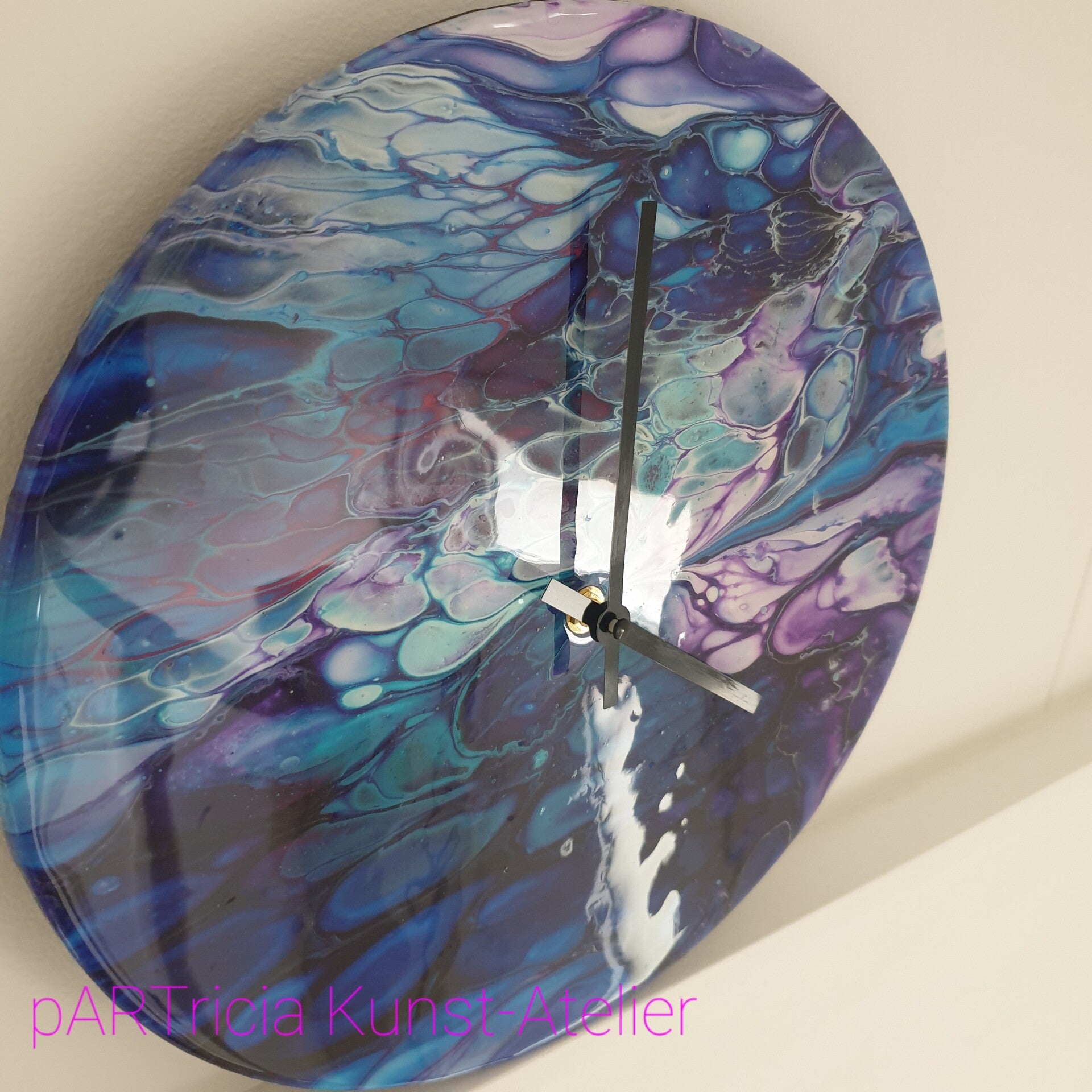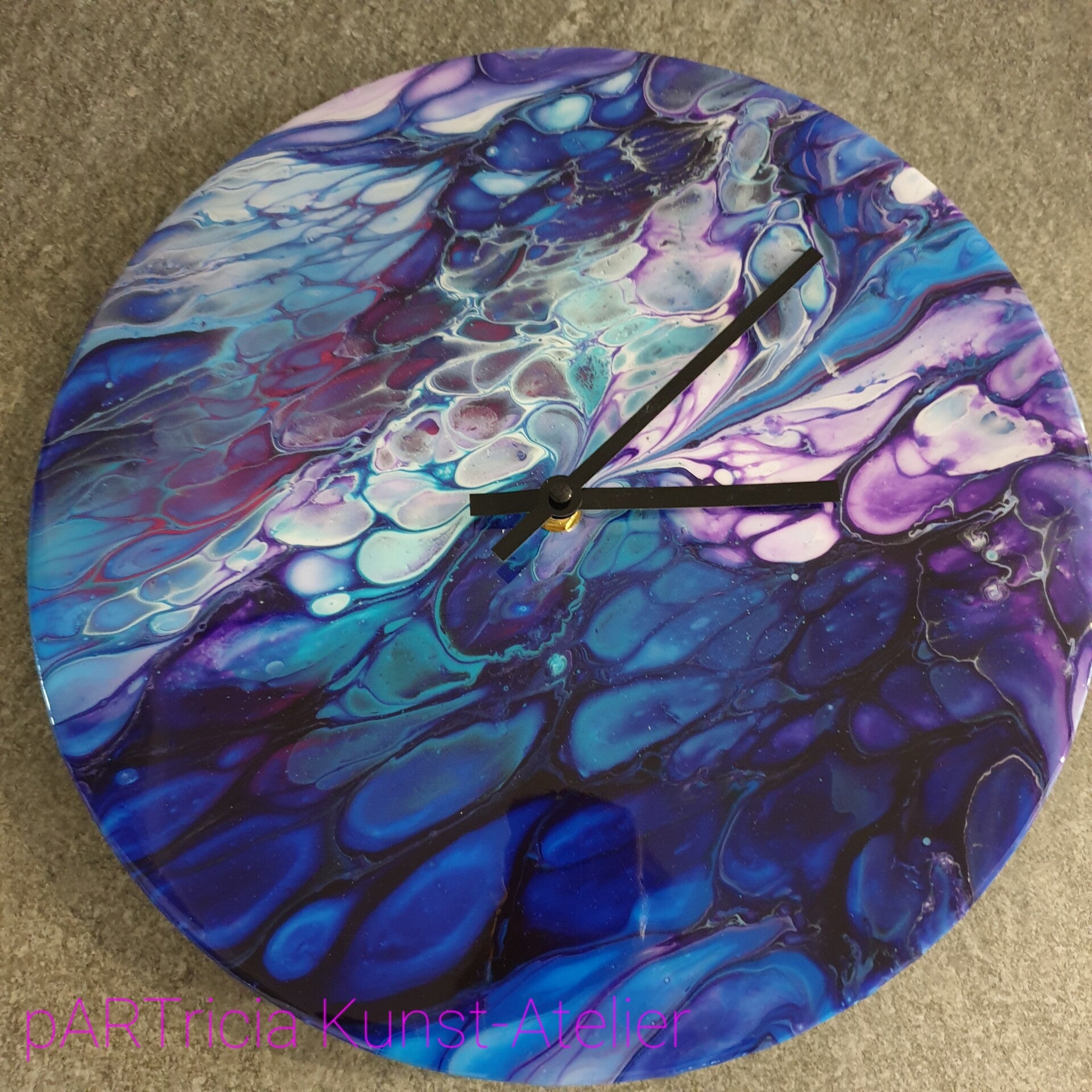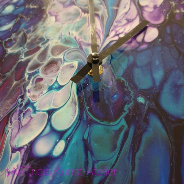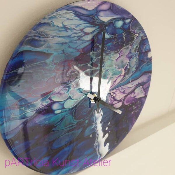 30 cm diameter MDF met acrylic pouring en epoxy (kunsthars) afwerkimg. Incl. quarz uurwerk en wijzers. (excl. batterij AAA)