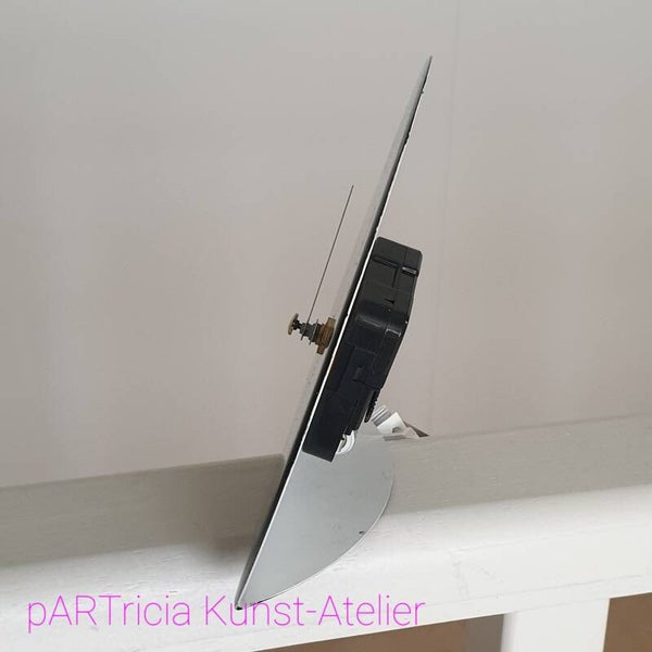 18 x 14 cm acrylic oouring op metalen plaatje met epoxy afwerking, klokmechanisme en wijzers.