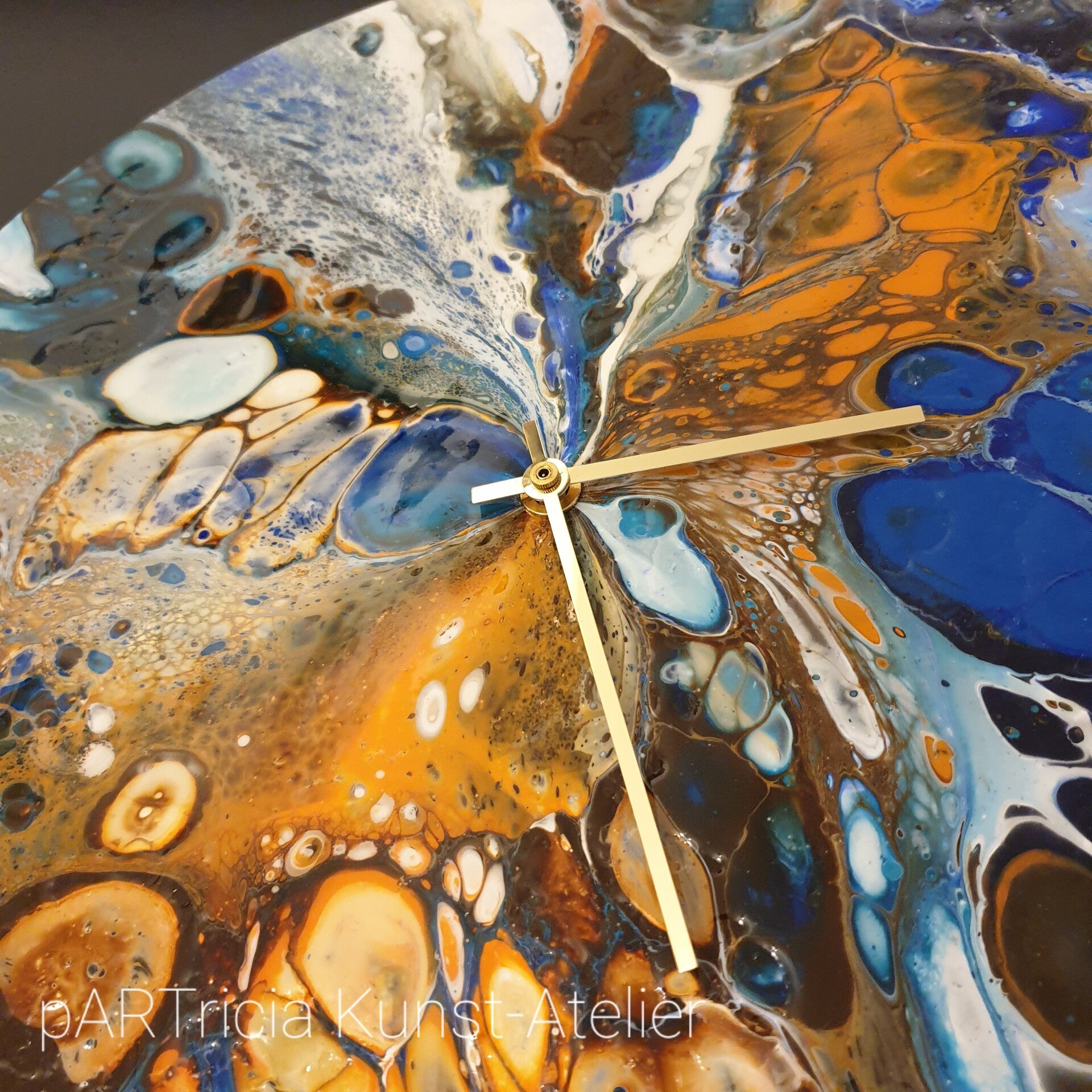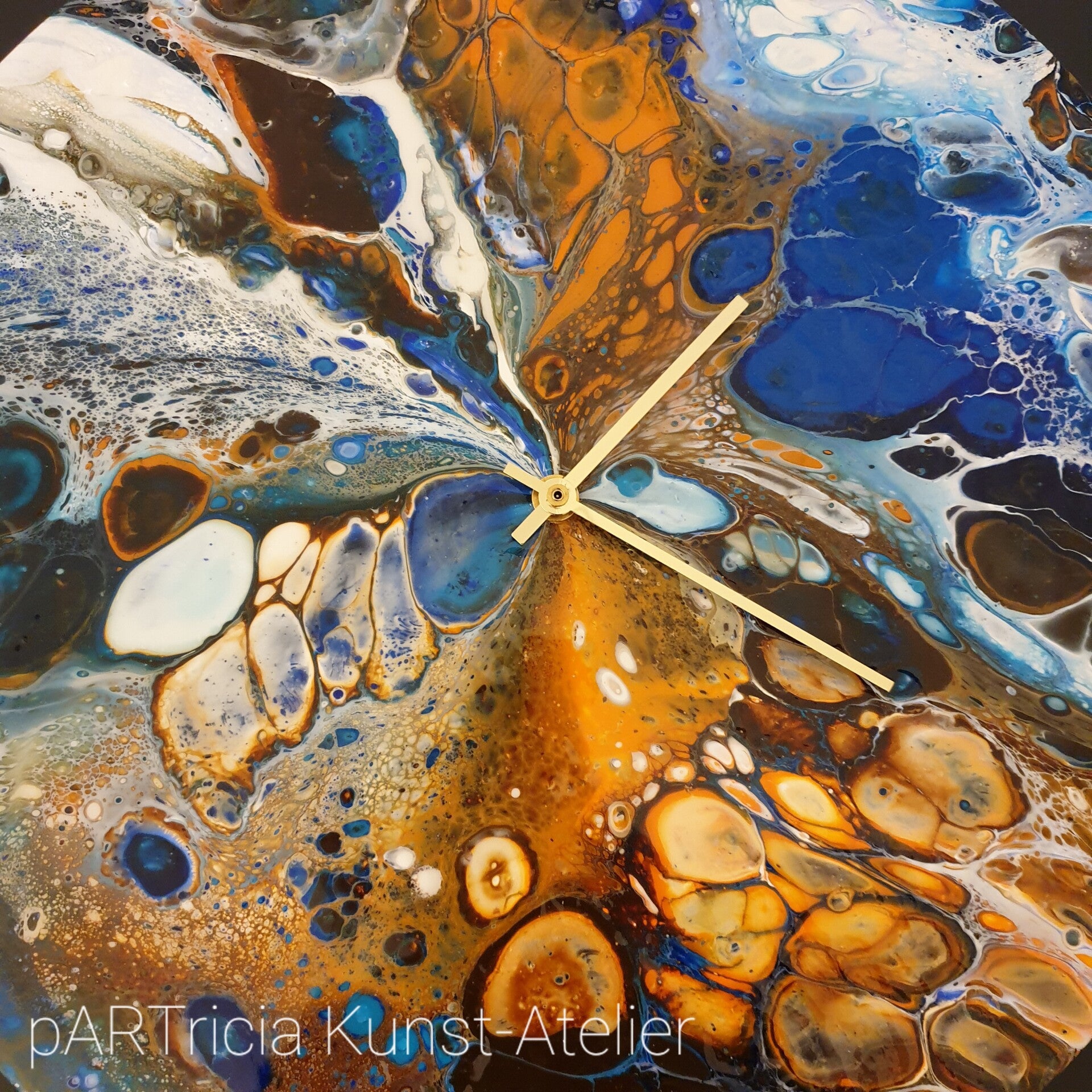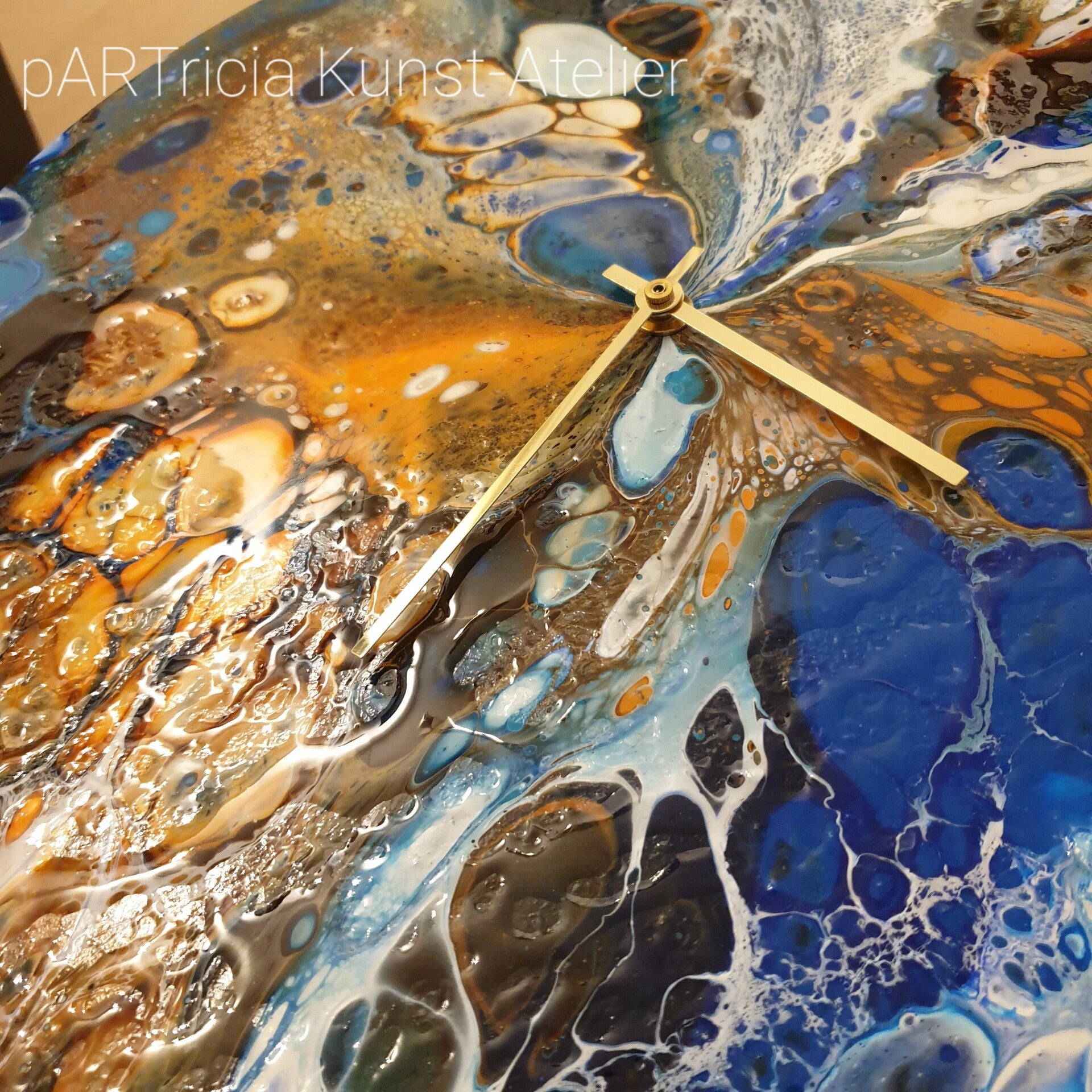 39 cm dia mango wooden plate with acrylic pouring, golden hands, clock mechanism and rough resin finish.